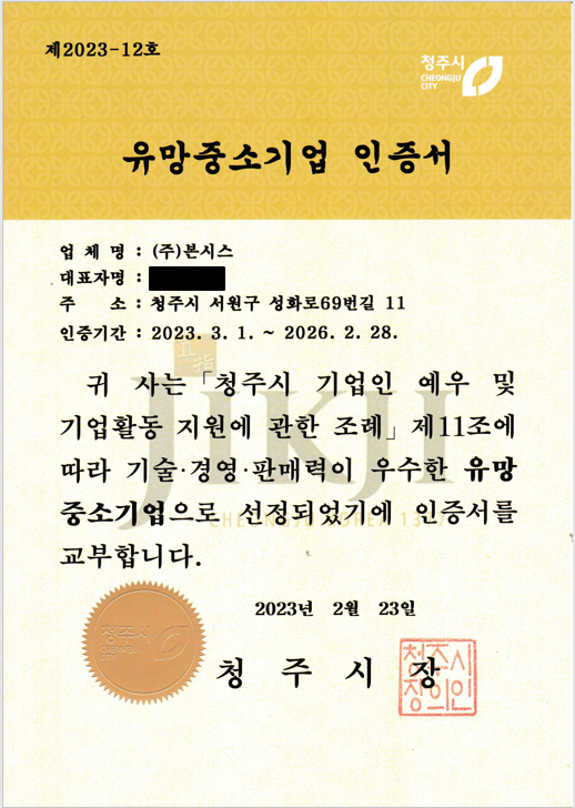2016년에 이어 2023년에도 "청주시 유망중소기업"으로 선정되었습니다.
