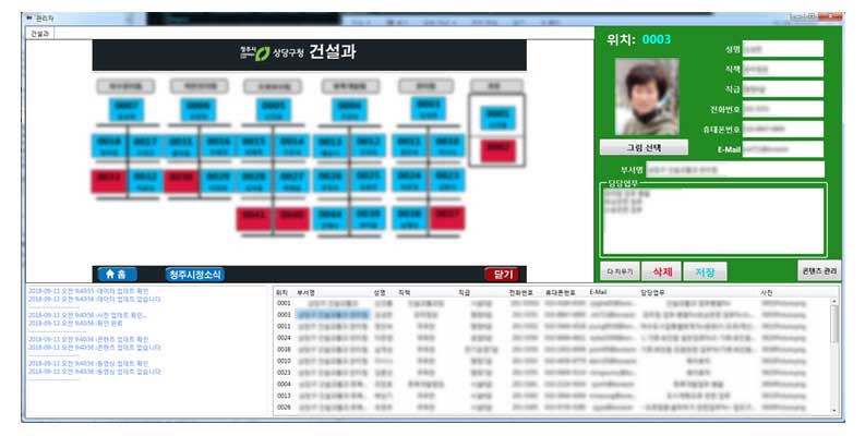 공간 내 부서별 조직 정보, 구성원 배치, 안내 콘텐츠를 통합 관리하는 시스템입니다.
