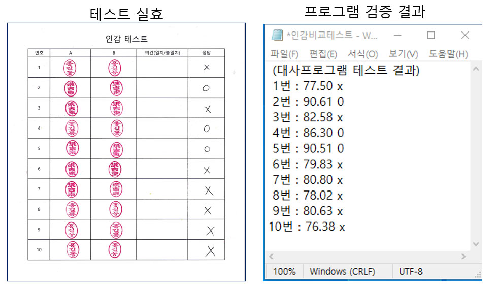- 원본 도장과 모방 도장을 스캐너로 인식하여 프로그램을 통해 비교한 결과입니다.